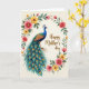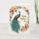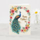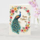 This card features a long-tailed bird in deep blue, green, and bronze, standing along the left side with a calm gaze that feels like a gentle nod of affection ❤️. Its crest and smooth profile are carefully drawn, and the tail flows downward in layered feathers dotted with teal and golden-orange “eye” markings that invite a lingering look. An off-white background keeps everything soft and airy, as if the scene is set in a quiet garden corner shared between close companions. Around the bird, an uneven floral garland curves like an embrace, mixing rosy pink, sunny yellow, and red blossoms with green leaves and small buds 🌼. The flowers and feathers balance each other, with the bird’s jewel tones leaning into the blossoms’ softer shades in a way that suggests closeness without needing faces. In the upper right area, a short message appears in flowing dark ink, positioned with plenty of open space around it so the eye moves easily from words to artwork. Fine shading shows subtle texture on the bird’s body and gentle color changes in the petals, and the garland frames the scene without fully closing the circle. The tail feathers fan out toward the lower center, with teal spots ringed in warm orange-gold against darker blue-green strands.