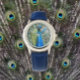 Stylish watch with white numerals that features the photo image of a gorgeous, blue Peacock with colorful fantail feathers. Select your watch from several styles.