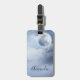 A luggage tag with a magical fantasy sky with fluffy blue clouds and a big beautiful moon. 2 white swans flying off together.