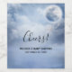 Baby shower or birthday bottle labels with a magical fantasy sky with fluffy blue clouds and a big beautiful moon. 2 white swans flying off together.
