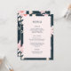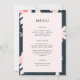 Beautiful floral pattern classic wedding menu features a delicate botanical pattern of blush pink flowers and a dark blue background.