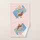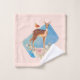 Towels with a pretty brown deer with a white spotted back. A little bird sitting on the deer's back. A fancy floral bouquet with watercolor roses and light olive green leaves under the deer's feet. A blue watercolor rectangle behind the image. Innocent and sweet design with rustic elegance. Peach colored background.