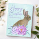 A beautiful Easter bunny sits behind a gorgeous bouquet of purple and teal flowers on a lovely pastel teal watercolor background with elegant personalized lavender script of your family name under Happy Easter. A chic, pretty Happy Easter postcard.