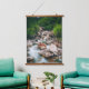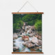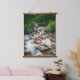 Landscape photograph of a beautiful river cascading through rocky river bed on a cloudy spring day with green trees around.