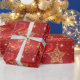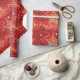 Pretty Christmas wrapping paper with gold metallic look star, sparkling stars and glitter on red.