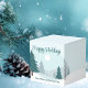 A beautiful winter landscape with teal green pine trees and snow covered ground on a small personalized holiday party favor box. Customize this company Happy Holidays chocolate for your corporate clients or employees.