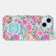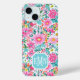Customize this gorgeous modern colorful flower garden of flowers in pink, orange, aqua, and yellow iPhone 15 case with your your initials in a modern CAP font in white on blue. It's so vibrant and happy!