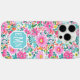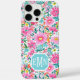 Customize this gorgeous modern colorful flower garden of flowers in pink, orange, aqua, and yellow iPhone 16 pro max case with your your initials in a modern CAP font in white on blue. It's so vibrant and happy!