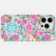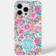 Customize this gorgeous modern colorful flower garden of flowers in pink, orange, aqua, and yellow iPhone 15 pro max case with your your initials in a modern CAP font in white on blue. It's so vibrant and happy!