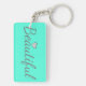 This is a cute turquoise color double-sided rectangle keychain for her that says 'Beautiful' in cursive silver letters below a cute silver heart. It will make a lovely gift idea for girlfriends, wives, moms, daughters or sisters!