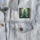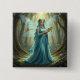 A beautiful fairy wearing a flowing turquoise-colored dress and a necklace made of turquoise stones with turquoise and holly in her long turquoise hair and iridescent dragonfly-like wings holding a holly branch stands in a magical forest surrounded by grass, rocks and vine-covered trees.