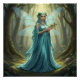 A beautiful fairy wearing a flowing turquoise-colored dress and a necklace made of turquoise stones with turquoise and holly in her long turquoise hair and iridescent dragonfly-like wings holding a holly branch stands in a magical forest surrounded by grass, rocks and vine-covered trees.