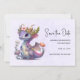 Save the date card with an illustration of a mythical dragon. Purple and blue scales. A flowered gold crown with horns adorns its head. Magical, fun and friendly.