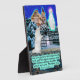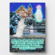 Beautiful 5 x 7 Eskie and Angel Scripture Plaque, with an easel, of a colorful, detailed winter scene with a soiled, homeless White American Eskimo Dog who is lost in a snowstorm. The dog is on bended knees and praying with paws together to a glorious Angelic Heavenly Being. She has a beautiful purple and white aura around her head and is at the entrance of a charming home. She has opened the iron gate for the lost dog and is welcoming the dog through the gate with outstretched hands. She has sanctified this home as the dog's new home by enveloping it with blue sparkles from Heaven. This scene accompanies the Bible verse Matthew 6:33, "But seek ye first the kingdom of God, and His righteousness; and all these things shall be added unto you." This plaque makes a wonderful gift or can be used to remind us of the Word of God.