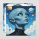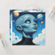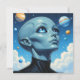 Ufology blank card. A beautiful female alien extraterrestrial being with big blue eyes looking up into space at the stars and planets.