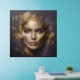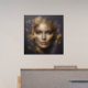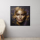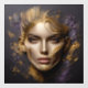 A portrait of a beautiful woman brought to life with a realistic effect. The image is embossed from textured black granite, and adorned with abstract golden lines, dark purple, and golden elements surround her face in an artistic embrace, creating a captivating and unique composition.