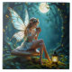 A fairy tale themed ceramic tile featuring a fairy sitting on a mushroom in an enchanted forest being lit up by lanterns drinking a warm cup of coffee.