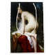This design features a painting by the French artist William-Adolphe Bouguereau (1825–1905). It depicts a beautiful young woman who is undressed after bathing in a wild pool of water. She is kneeling on a patch of grass at the edge of the pool, and she is smiling gently at the viewer as she runs her fingers teasingly through her hair. Her skin is milky white and soft. She is leaning on an elegant piece of red fabric and she has a white towel, which she is going to dry her body with. The sole of one of her feet is raised in the air as she kneels. The original artwork was painted by Bouguereau in 1864.
