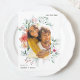 This pretty wedding save the date announcement features colorful watercolor blooms and delicate soft peach, ivory white, and pink flowers, with subtle green leaves on a white background which add a soft beauty to this romantic design. A beautiful arch shape photo sits in the middle of the card. Shop this store for coordinating wedding invitations.