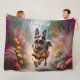 A beautiful German shepherd runs through colorful flowers on this design which is perfect for breeders, kennels, or dog lovers.