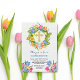© 2023 Socialite Designs & LICENCORS. Beautiful Easter invitation with a gold cross, tulip frame and Easter eggs. A wonderful invitation to invite family and friends for an Easter brunch, egg hunt for the kids, or Easter dinner.