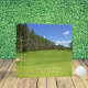 Enjoying the scenery of the day on a golf course. Panoramic view of a beautiful green, tree lined, golf course with blue sky. Templates for name and subtitle.