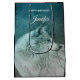 Gift bag with a photograph of a gorgeous furry fluffy grey wolf. In the background is a dark forest with trees. Magical mystical vibe.