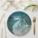 Paper plates with a photograph of a gorgeous furry fluffy grey wolf. In the background is a dark forest with trees. Magical mystical vibe.