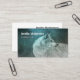 Business cards with a photograph of a gorgeous furry fluffy grey wolf. In the background is a dark forest with trees. Magical mystical vibe.