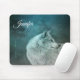 A mouse pad with a photograph of a gorgeous furry fluffy grey wolf. In the background is a dark forest with trees. Magical mystical vibe.