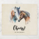 Cheers! Sparkling wine bottle labels with a beautiful watercolor drawing. Featuring a pair of horses, brown and white. Head and neck visible with dripping paint along the base of their neck. Southwestern vibe.
