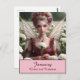 A beautiful buff haired fairy with white and buff colored wings wearing a pretty burgundy dress and a garnet necklace holds a single white carnation while standing in a field of carnations.