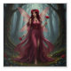 A beautiful fairy wearing a flowing red dress and a necklace and belt made of garnets with carnations and garnets in her long dark red hair and light red dragonfly-like wings holding a red carnation in each hand walks through a magical forest surrounded by fireflies, flowers and mossy vine-covered trees.