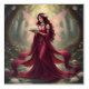 A beautiful fairy wearing a flowing red dress and jewelry made of rubies with water lilies in her long red hair and light red dragonfly-like wings holding a water lily stands in a shallow pond in a magical forest surrounded by water lilies, lily pads, pink flowers and vine-covered trees.