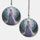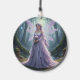 A beautiful fairy wearing a flowing lavender dress and a necklace made of pearls with roses in her long lavender hair and light purple dragonfly-like wings holding a rose stands in a magical forest surrounded by blue and purple flowers and moss-covered trees.