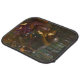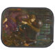 This design features a painting by the English Pre-Raphaelite artist John William Waterhouse (1849–1917). It shows an attractive woman in a Medieval woodland. There is a knight in armor kneeling down beside her. She is wrapping her long brown hair around his neck, bringing him closer to her as looks lovingly into his eyes. She is wearing a purple dress and she has bare feet. There are flowers strewn around her. The knight looks bewildered but entranced by the woman's beauty. The scene is based on a ballad by English poet John Keats called "La Belle Dame sans Merci" [The Beautiful Lady Without Mercy]. The poem is about a fairy who condemns a knight to an unpleasant fate after she seduces him with her beautiful eyes and singing. The original artwork was painted by John William Waterhouse in 1893.