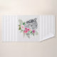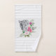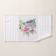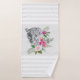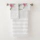 Towel set with a beautiful illustration featuring a gray, black and white leopard portrait. This lovely animal is surrounded by a tropical flower bouquet. Elegant, exotic and lovely. Surrounded by classy gray stripes.