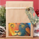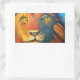 A rectangular sticker with an oil painted digital image of a close up of a lions face, with piercing yellow eyes. Dominant colors include orange and yellow. Looking proud, regal and fierce.