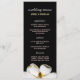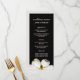 Beautiful wedding menu with two different fonts in three pastel colors, and a white magnolia on a black background.