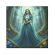 A beautiful fairy wearing a flowing teal dress and a necklace made of aquamarine stones with daffodils and aquamarines in her long teal-colored hair and light teal dragonfly-like wings holding a daffodil stands in a magical forest surrounded by blue mushrooms, yellow daffodils and mossy trees.