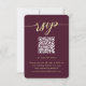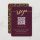 This elegant wedding response card features a place for your QR code so that guests can easily rsvp on your wedding website. The front features a simple and clean layout with trendy script typography and a burgundy marsala background. The back is a beautiful botanical berries and greenery holiday print, perfect for a Christmas or winter wedding.