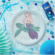 Beautiful Pink Haired Cartoon Mermaid with multi colored tail sitting on top of a sea turtle paper plate, can easily add birthday child's name for a personal touch.