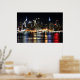 Gorgeous, colorful photo of the New York skyline at night with its lit up buildings being reflected in the dark river.