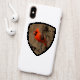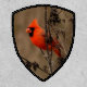 Awesome red bird in the branches of a dead or fall tree with brown leaves. The background makes the bright red of the birds feathers stand out and pop.
