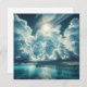 Blank card. Beautiful ai art showing the sun shining through the fluffy clouds above a gorgeous ocean view with an ocean dock.