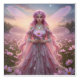A beautiful fairy wearing a flowing pink dress and a necklace made of opals with opals and cosmos flowers in her long pink hair and light pink dragonfly-like wings holding a pink cosmos flower stands in a magical field of cosmos flowers surrounded by bubbles against an afternoon sky.