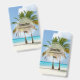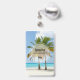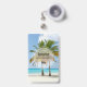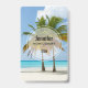 A name tag with a beautiful and tranquil photograph of 2 palm trees under a bright blue sky.