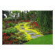 View into a lovely garden. Water, pink and yellow flowers, palm trees and cypresses. Photo taken at Flor and Fjaere Park, Stavanger region, Norway.