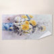 Paul De Longpre painting of yellow and white flowers in a blue and white vase with Bumble Bees collecting nectar.