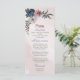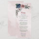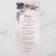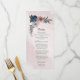 Beautiful romantic pink, white and navy blue flowers with green leaves wedding menu.